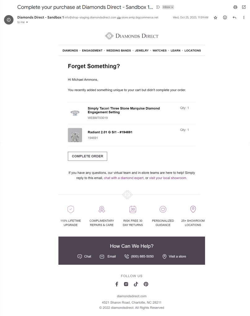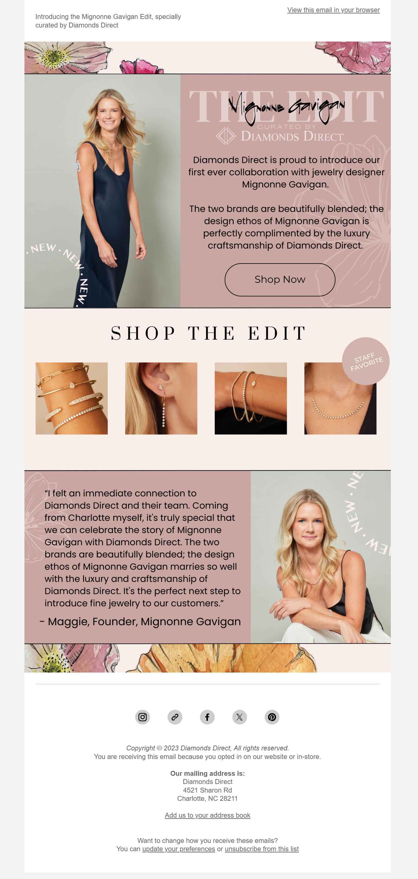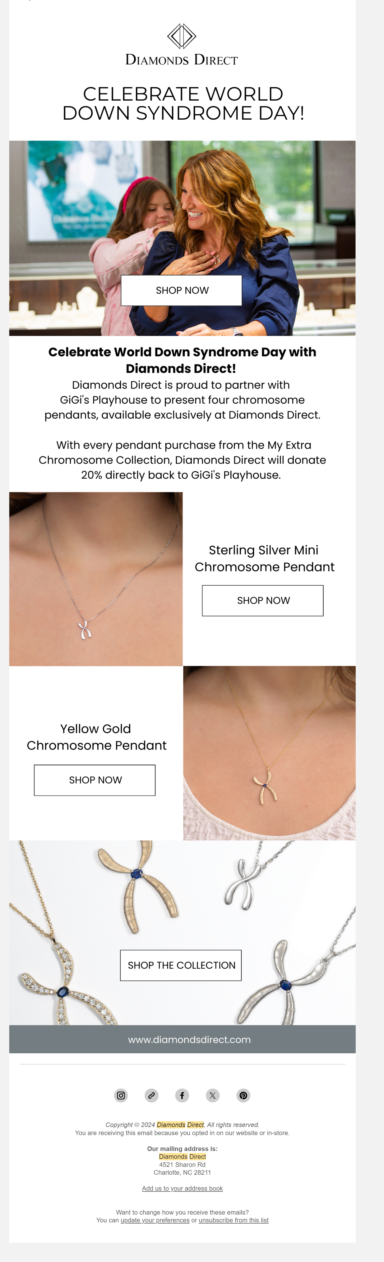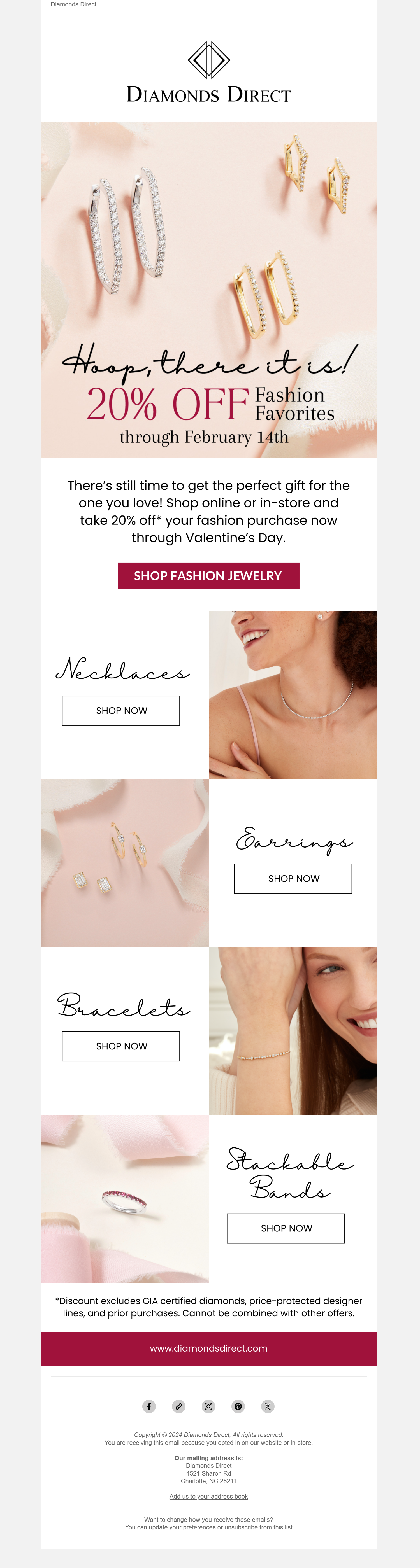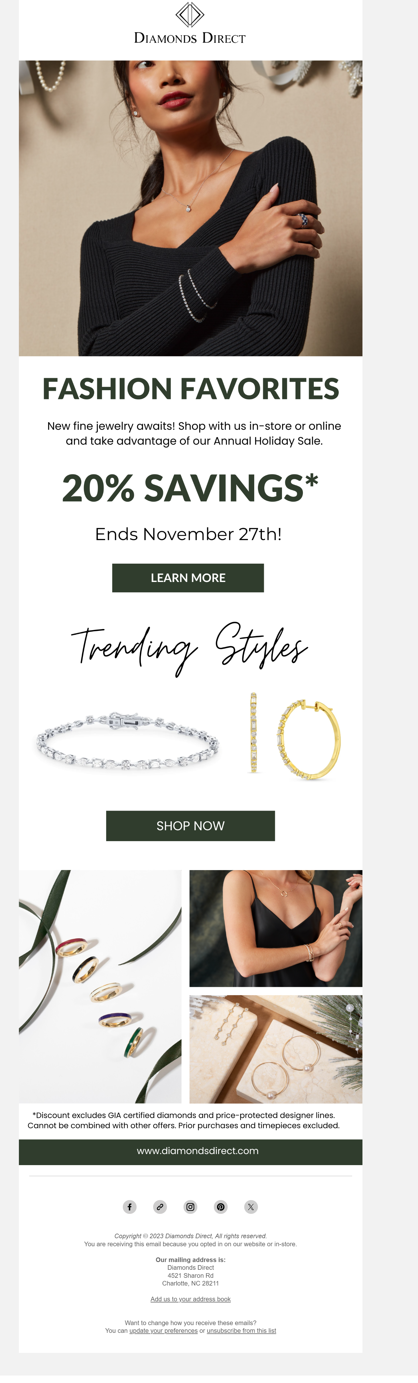Email Marketing from multiple online promotional campaigns for online. Results varied per campaign, but online experienced 35% sales growth vs prior weeks and more than 100% order increase during fine jewelry sale promotional periods.